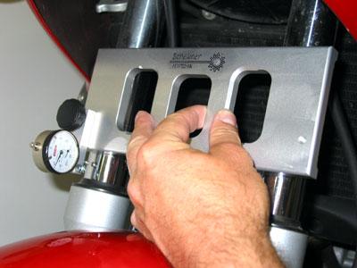 Die Verkippung einer planparallelen Platte auf den Standrohren wird mittels einer Messuhr exakt erfasst. Zunächst werden die Verschraubungen der Vorderachse und der Standrohre gelöst. Mehrere Messungen im Verlauf der schrittweisen Drehung der Standrohre in den Gabelbrücken ermöglichen Aussagen zu der Durchbiegung der Standrohre und der Verdrehung der unteren Gabelbrücke. Die nach einem vorgegebenen Schema ermittelten Verkippungen der Messplatte werden in die Software eingetragen. Das Ergebnis ist eine schnelle Diagnose direkt am Fahrzeug. Eine mögliche Beschädigung kann so vor einer Instandsetzung ohne Zerlegen der Gabel veranschaulicht werden.